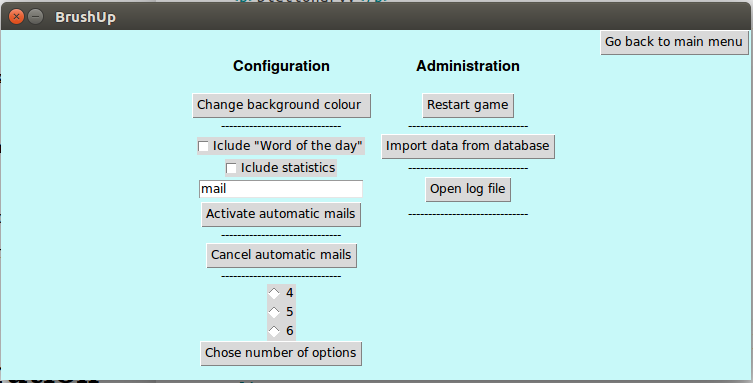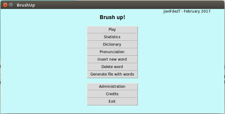 Onced logged into your personal account, the main page will pop up. You dictionary will contain only one word (brush up), so you can import a list of words from the admin's database (brush_up/BrushUp/BBDD/admin.db) by clicking on "Administration"->"Import data from database".